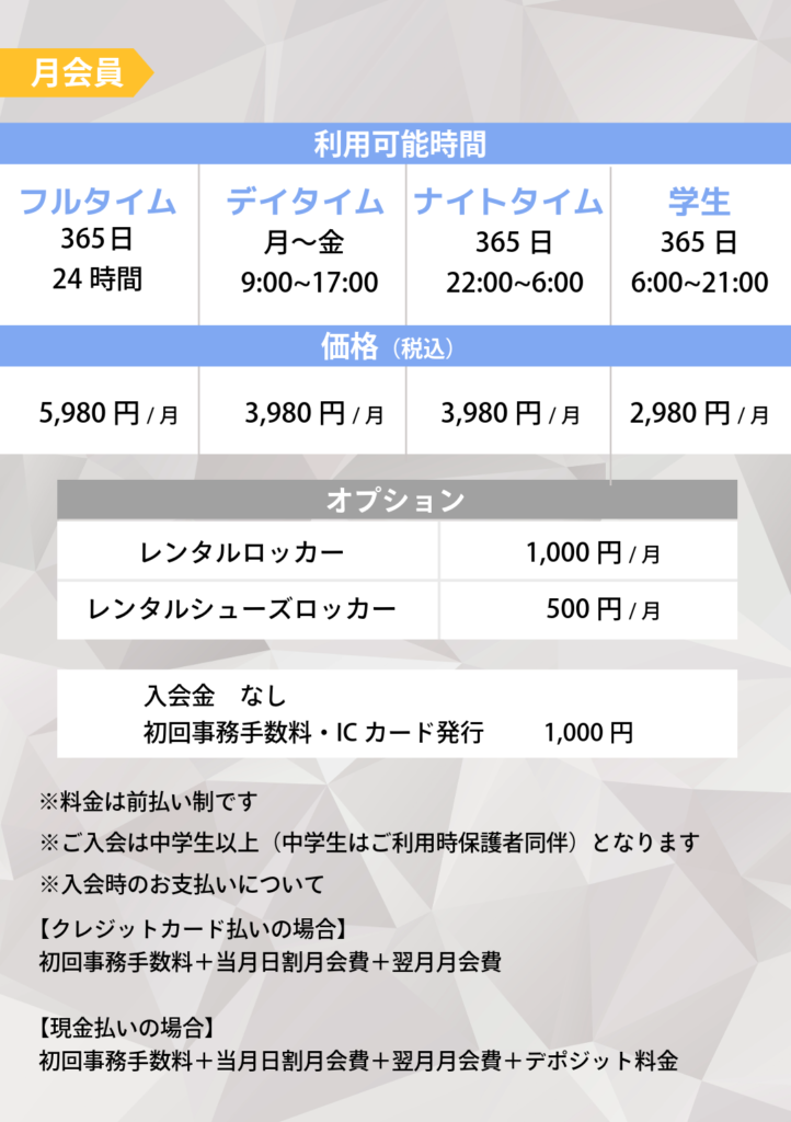 初回登録時 事務手数料1,000円と2ヶ月分の月会費を前納いただきます。