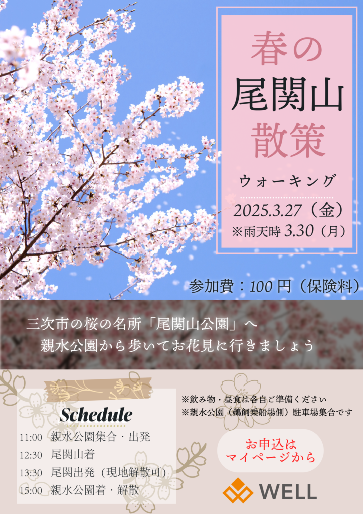 春の尾関山散策開催! 2026年3月5日 WELL 春のお花見、秋の紅葉狩りと好評をいただいているウォーキング♪ 3/27(金)に開催します! 参加ご希望の方はマイページまたは店頭にてお申込みください。 参加料は100円(集団保険に加入します)